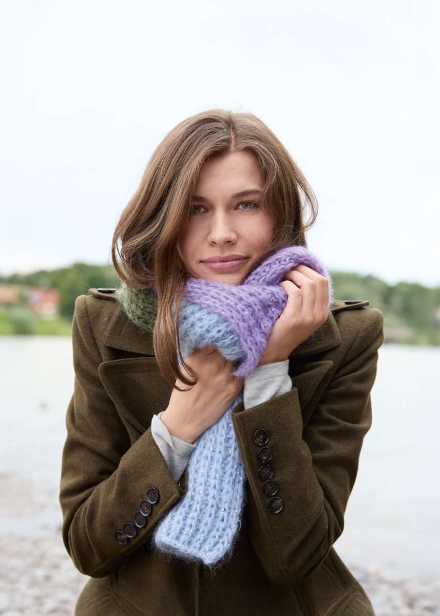 Lana Grossa „Mohair di Gio“ (55% Mohair (Superkid), 45% Schurwolle (Merino superfine), LL = 85 m/50 g): 100 g Pastellblau (Fb 10), je 50 g Fliederlila (Fb 1) und Farngrün (Fb 14), Lana Grossa „Glamour“ (55% Polyamid, 45% Polyester, LL = 115 m/25 g): 50 g Silbergrau (Fb 1), je 25 g Lila (Fb 3) und Oliv (Fb 17); Strick-Nd Nr 8.