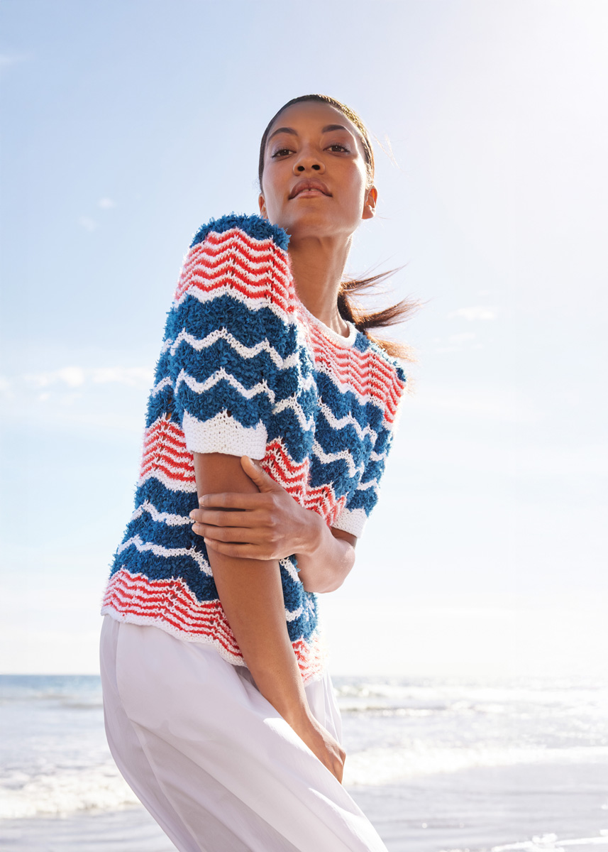 Lana Grossa Landlust Baumwolle (100% Baumwolle (Bio), Lauflänge 115 m/50 g), 150 (200 - 200) g in Weiß (Fb 4), Lana Grossa Frizzante (54% Baumwolle, 46 Polyamid, Lauflänge 105 m/50 g), 150 (200 - 200) g in Petrolblau (Fb 7) und Lana Grossa Per Fortuna (74% Baumwolle (Bio), 26% Polyamid, Lauflänge 190 m/50 g), 50 (100 - 100) g in Leuchtendrot (Fb 64); Stricknadeln Nr 4, 1 Rundstricknadel Nr 4, 40 cm lang.