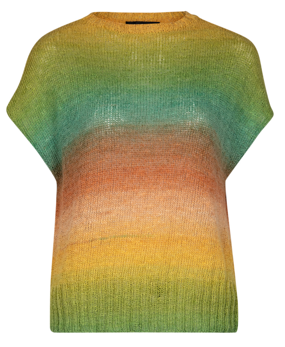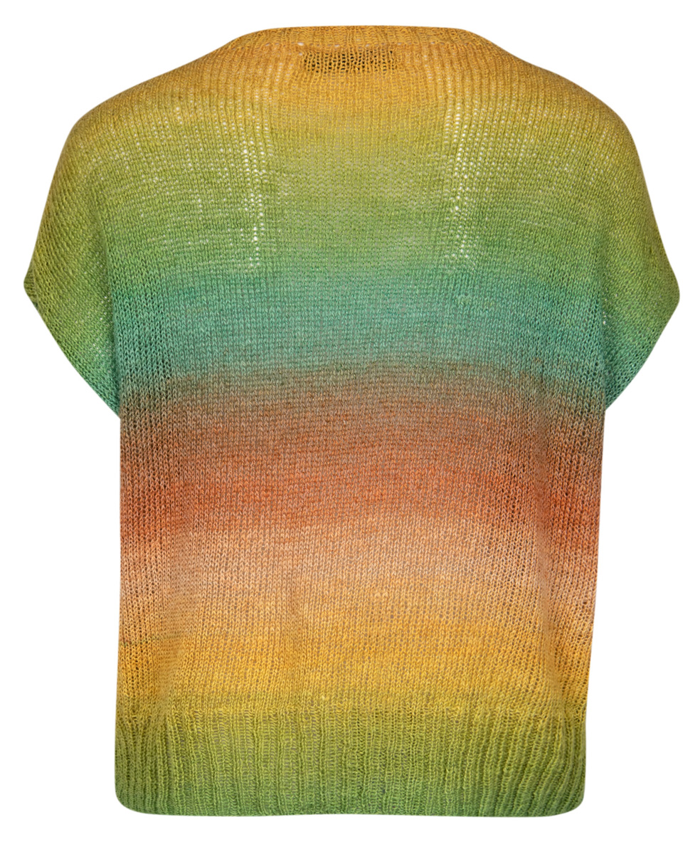 Lana Grossa-Qualität „Mare” (50 % Leinen, 33 % Seide, 17 % Baumwolle, LL = ca. 330 m/100 g): ca. 300 (300 – 400) g Helloliv/ Senf-/Sonnengelb/Pfirsich/Puderbraun/Terracotta/ Jade (Fb. 9); Stricknadeln Nr. 3 und 3,5, 1 Rundstricknadel Nr. 3, 50 cm lang.