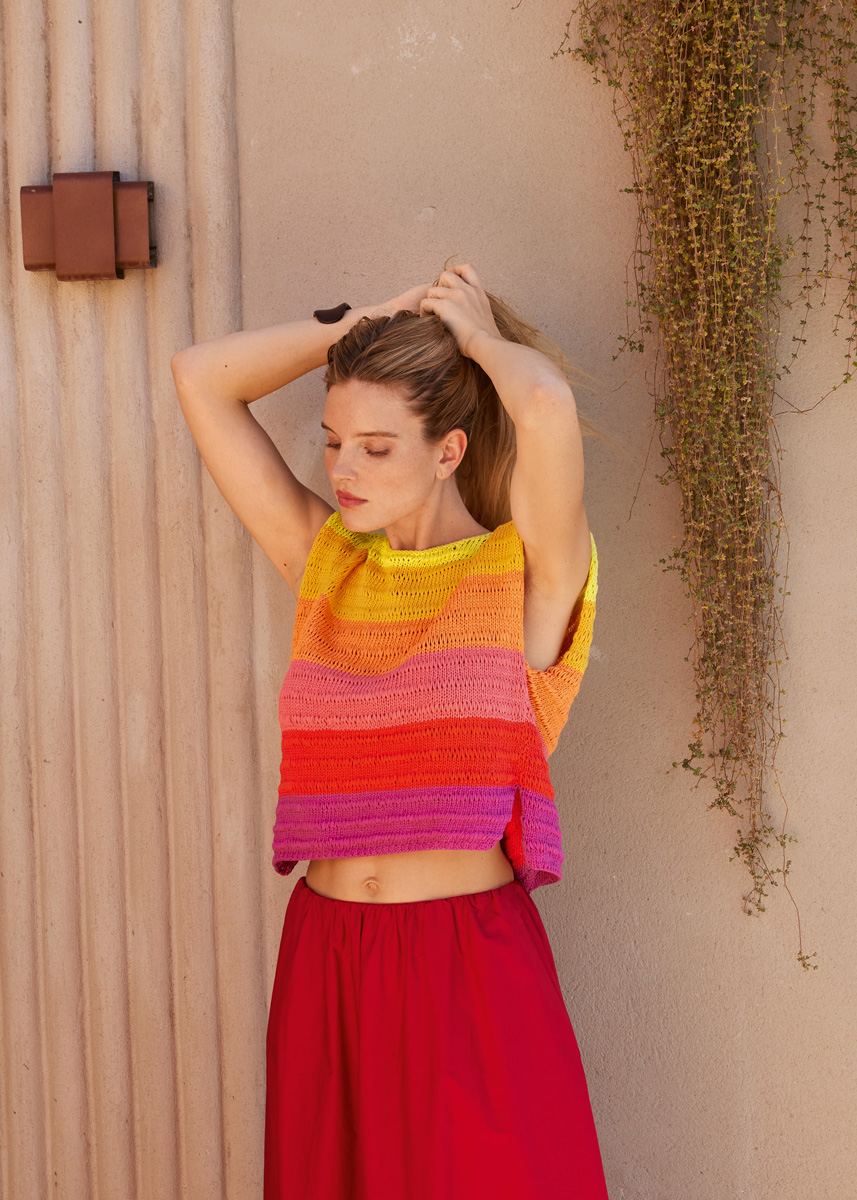 Beim Top in Sunset-Farben erzeugen glatt rechts gestrickte Passagen im Wechsel mit zwei Reihen Fallmaschen den interessanten Stripe-in-Stripe-Effekt, der das Colourblocking besonders schön betont. Typisch TESSERA: die pudrig-matte Optik. Die Seitenschlitze sind ein hübsches Detail.