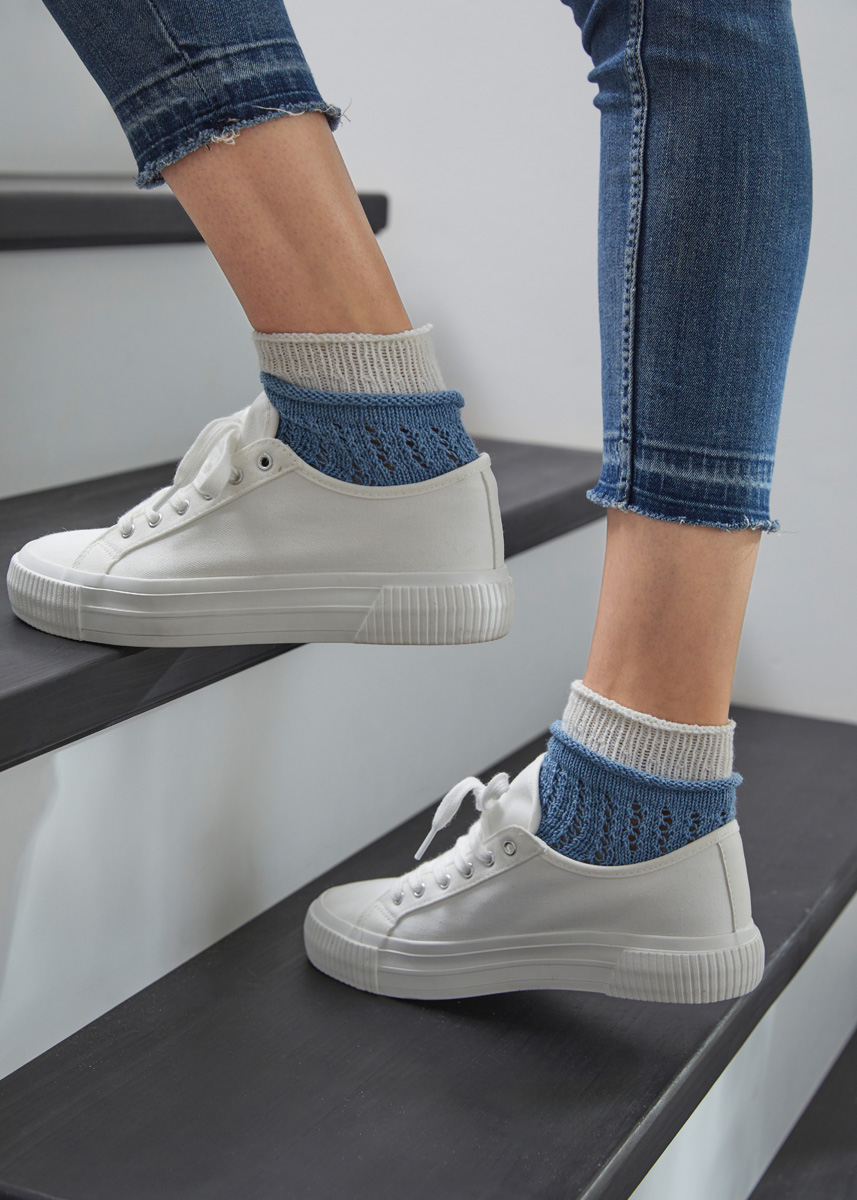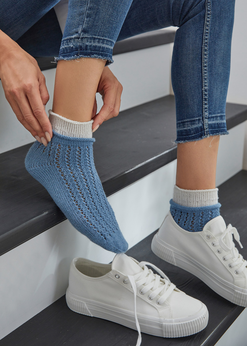 Lana Grossa „Meilenweit 100g Cotton Bamboo“ (40% Baumwolle, 25% Schurwolle, 20% Viskose (Bambus), 8% Polyamid, 7% Polyester, Lauflänge = 420 m/100 g): 100 g Graublau (Fb 12) und 100 g oder Reste Weiß (Fb 9); 2 Nadelspiele Nr. 2,5