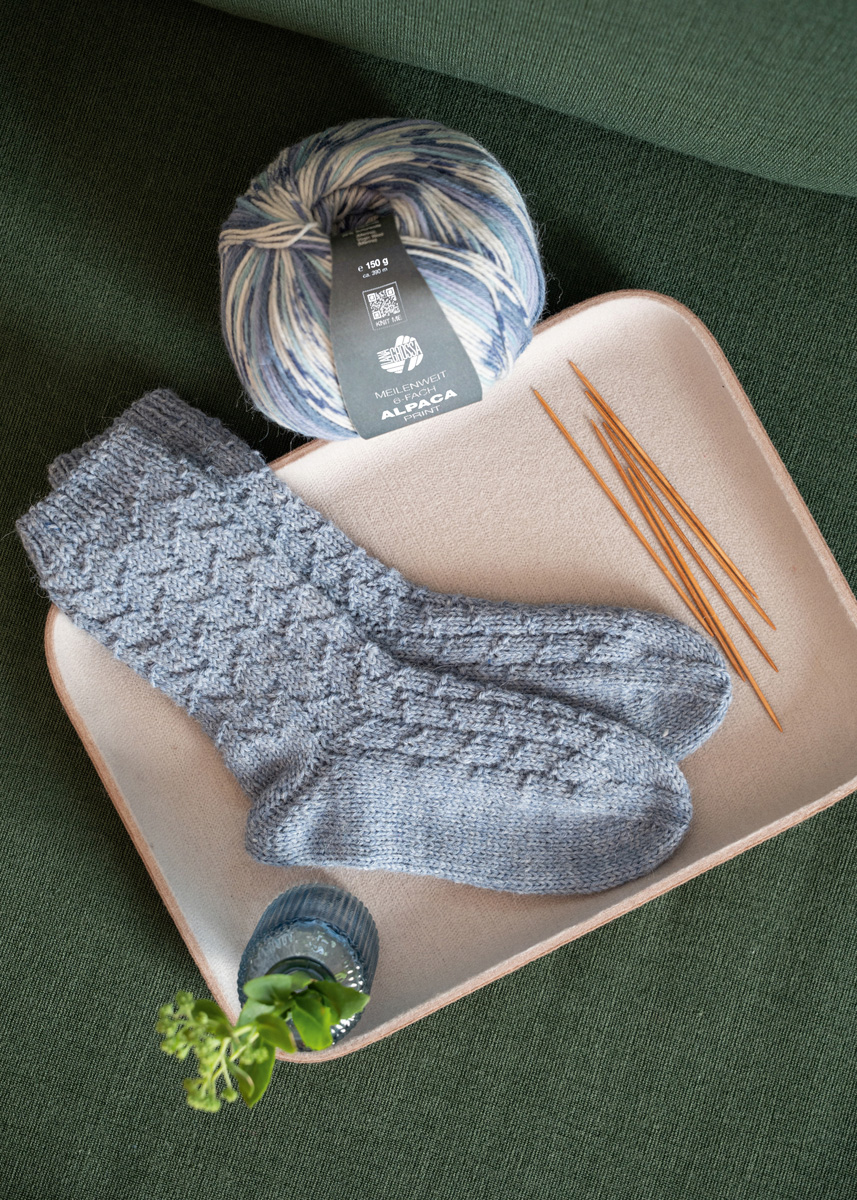 Das Strukturmuster ist für Socken deren M-Zahl durch 8 teilbar ist in jeder Größe und Garnstärke einsetzbar.