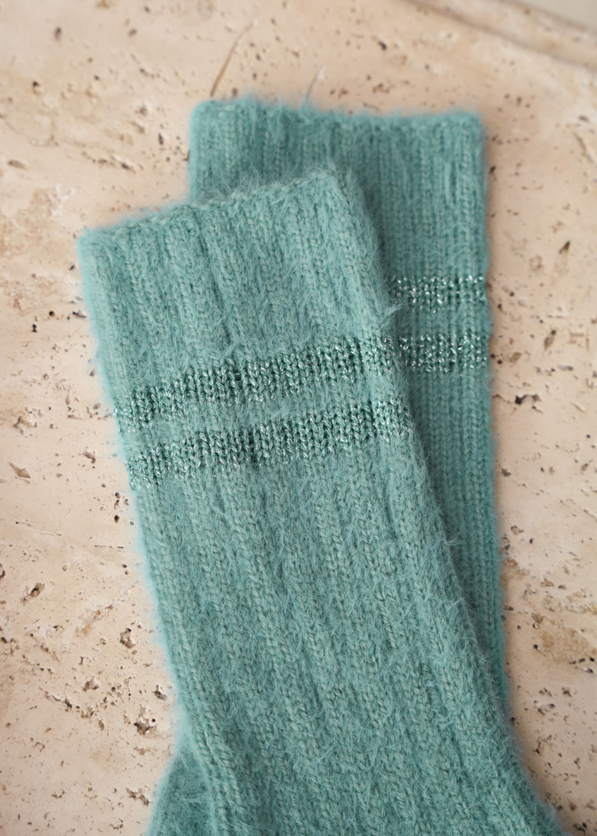 Variante A: Lana Grossa-Qualität Cosy Socks (70% Schurwolle (Merino), 30% Polyamid, LL = ca. 400 m/100 g): 100 g Hellblau (Fb 4) und Brillino (83% Viskose, 17% Metallische Faser, LL = ca. 200 m/25 g): 25 g Hellblau/Silber (Fb 22); Variante B: Lana Grossa-Qualität Cosy Socks (70% Schurwolle (Merino), 30% Polyamid, LL = ca. 400 m/100 g): 100 g Rosa (Fb 1) und Brillino (83% Viskose, 17% Metallische Faser, LL = ca. 200 m/25 g): 25 g Weiß/Rosa (Fb 8); Variante C: Lana Grossa-Qualität Cosy Socks (70% Schurwolle (Merino), 30% Polyamid, LL = ca. 400 m/100 g): 100 g Salbeigrün (Fb 6) und Brillino (83% Viskose, 17% Metallische Faser, LL = ca. 200/25 g): 25 g Türkis/Silber (Fb 36). Für alle Varianten: ein Nadelspiel Nr 2,5.