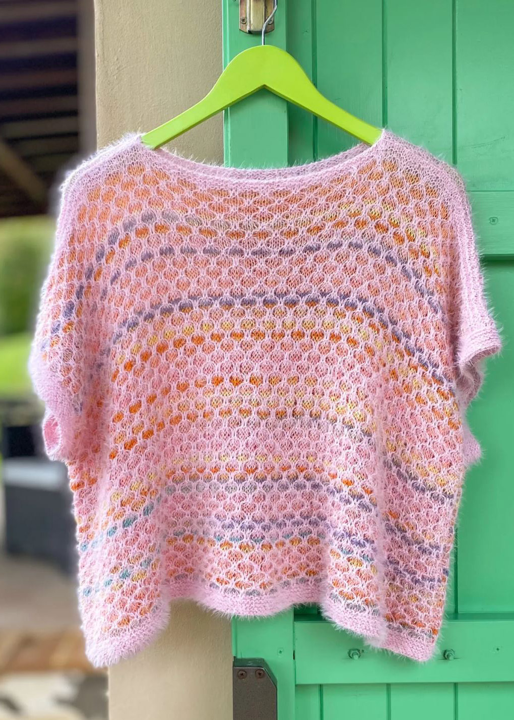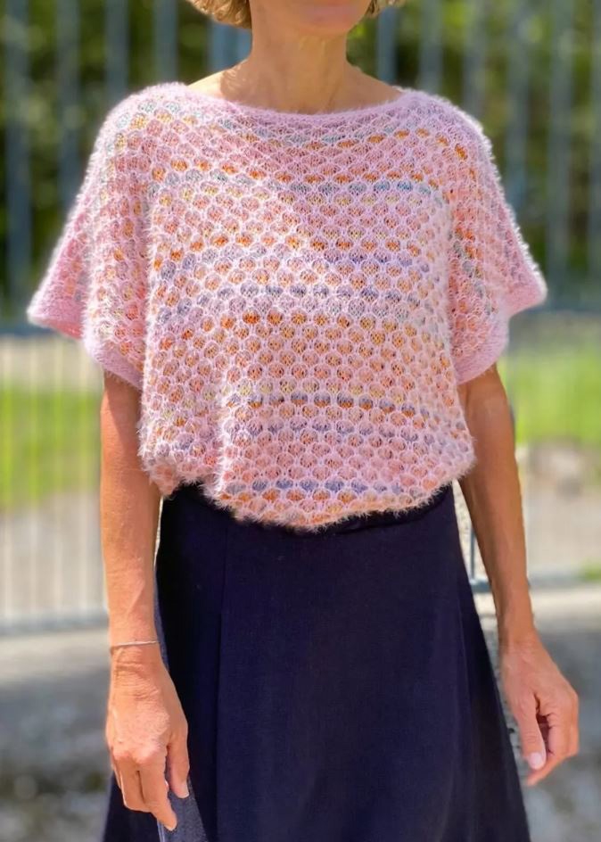 Garn 1, Per Frotuna (74 % Baumwolle, 26 % Recyceltes Polyamid, Lauflänge: ca. 190 m / 50 g), Fb. 36 (Rosé), 150-200 (200) g; Garn 2, Gomitolo Lino (60 % Baumwolle, 28 % Viskose, 12 % Leinen, Lauflänge: ca. 290 m / 100 g) Farbe 2013, 200 g