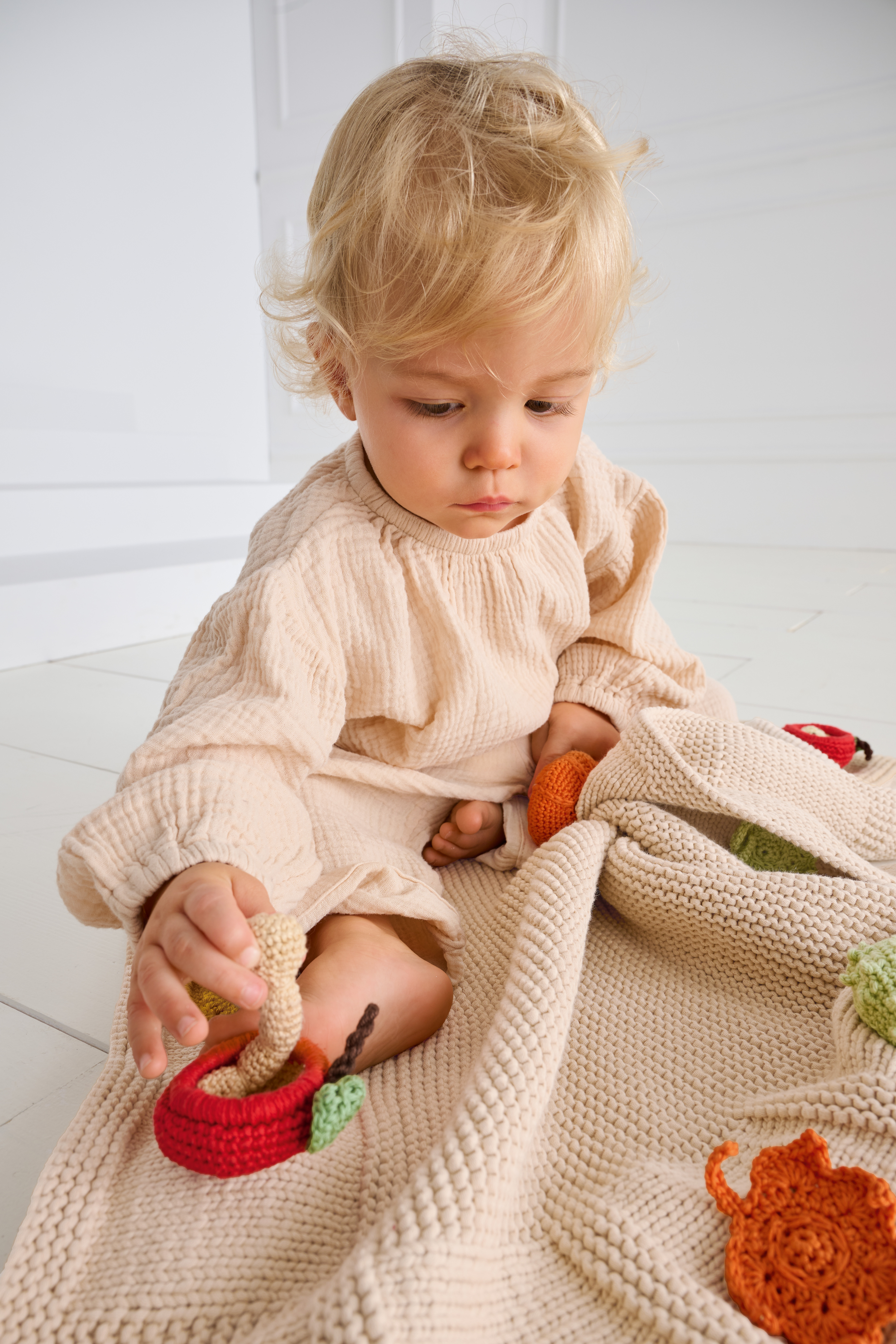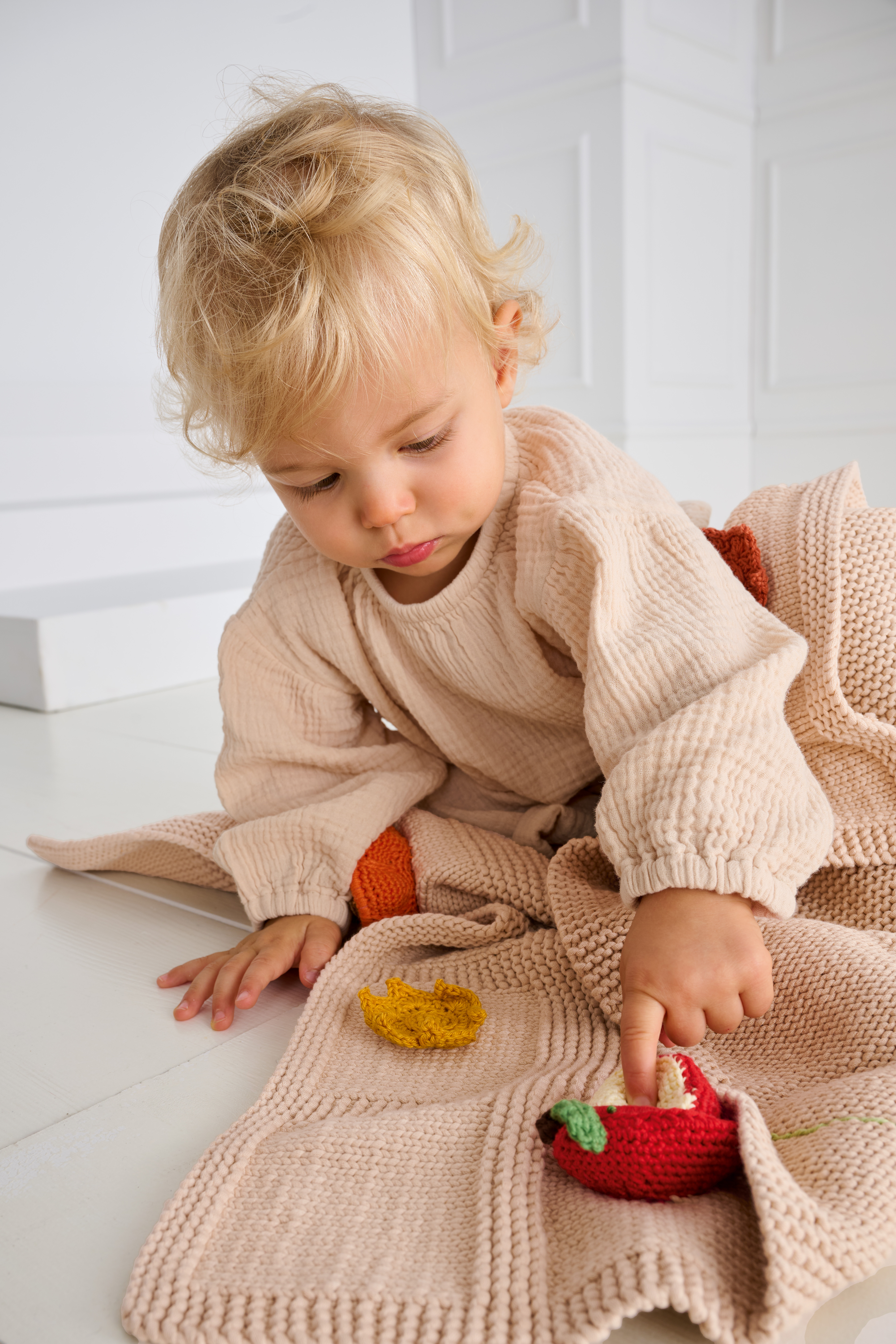 Lana Grossa Summer Softness (80% Baumwolle (Bio), 20% Schurwolle (Merino superfine); LL = 130 m/50 g: 600 g in Beige (Fb. 3) und Lana Grossa Cotone (100% Baumwolle, gekämmt, gasiert, mercerisiert; LL = 125 m/50 g): je 50 g Frühlingsgrün (Fb. 127), Rot (Fb. 18), Kürbis (Fb. 39), Vanille (Fb. 64), Beige (Fb. 26), Goldbraun (Fb. 130), Farngrün (Fb. 54), Mokka (Fb. 29), Schwarz (Fb. 21), Rost (Fb. 113) und Braun (Fb. 37); eine Rundstricknadel 4 mm; eine Häkelnadel 2,5 mm und 3 mm; Füllwatte; 6 gepolsterte Haargummis, 3,5 – 4 cm Ø.