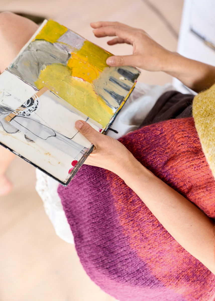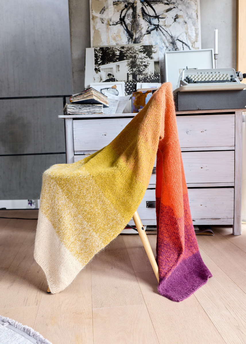 Lana Grossa-Qualität „Setasuri” (69 % Alpaka (Suri), 31 % Seide, LL = ca. 212 m/25 g): je ca. 75 g Bordeaux (Fb. 31), Hummer (Fb. 23), Rostorange (Fb. 63), Honiggelb (Fb. 65) und Hellbeige (Fb. 58); 1 Rundstricknadel Nr. 6,5, 80 cm lang.