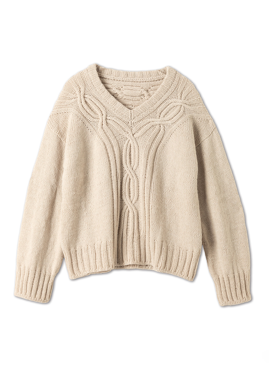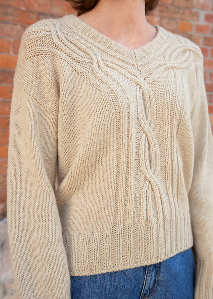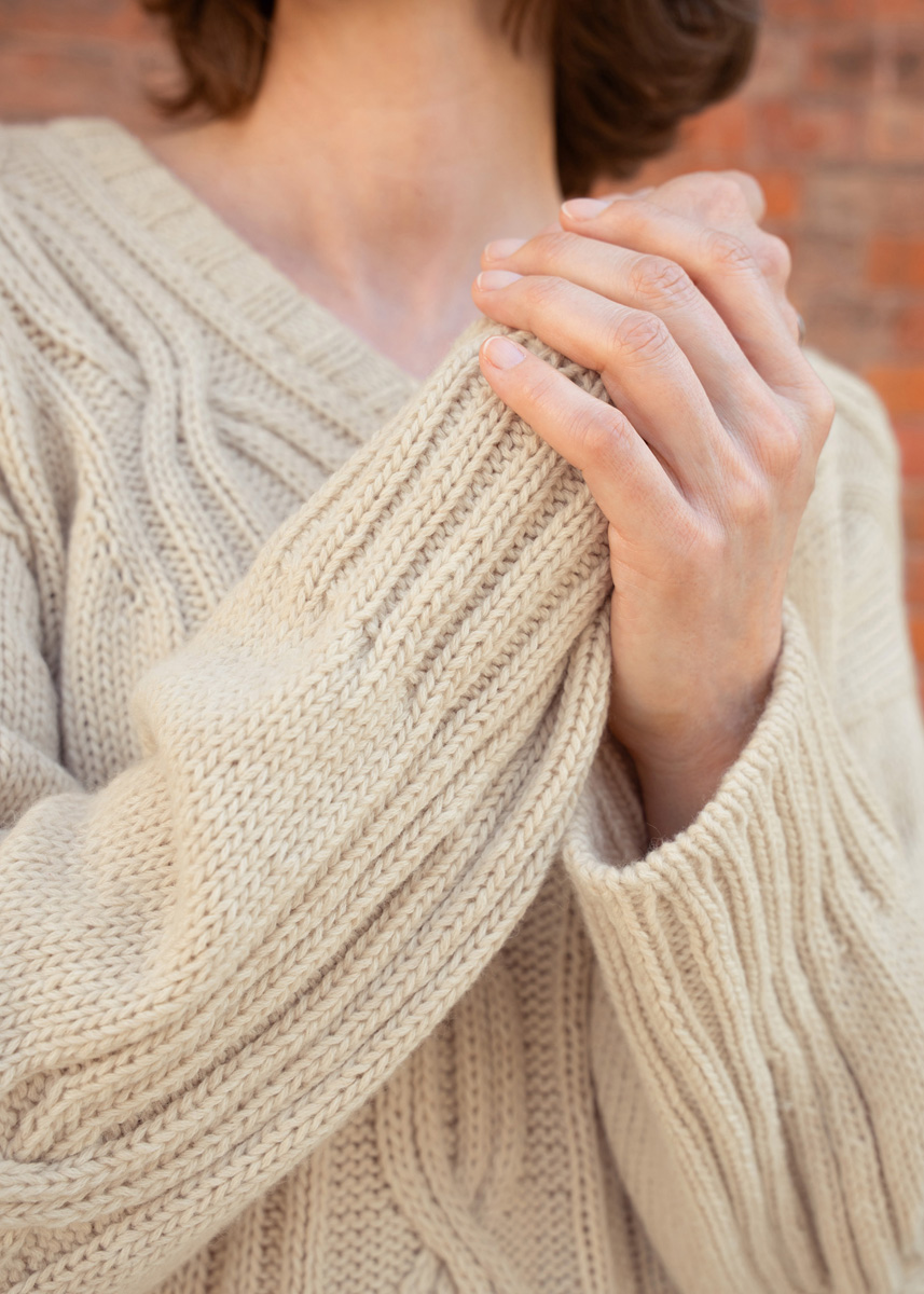 Danach folgen die beiden Vorderteile, deren Maschen aus dem Zopfband aufgenommen werden. Der V-Ausschnitt entsteht durch gezielte Zunahmen entlang des Zopfbandes. Nach Erreichen der gewünschten Tiefe werden die Vorderteile verbunden, Vorder- und Rückenteil zusammengeführt und der Körper in Runden im Muster gestrickt. Vor dem Bündchen sorgen Abnahmen für eine schöne Silhouette, das Bündchen wird italienisch abgekettet.