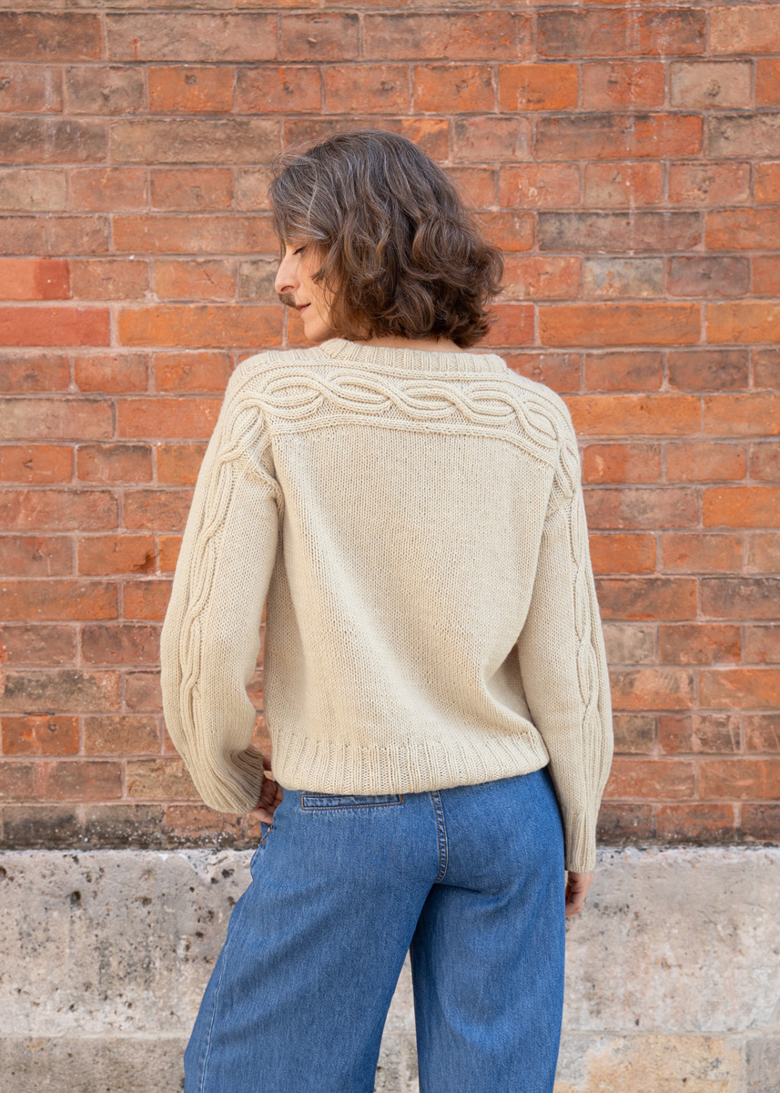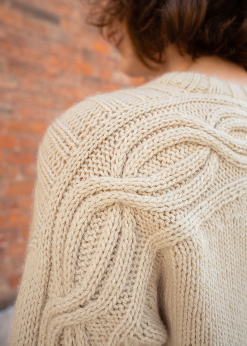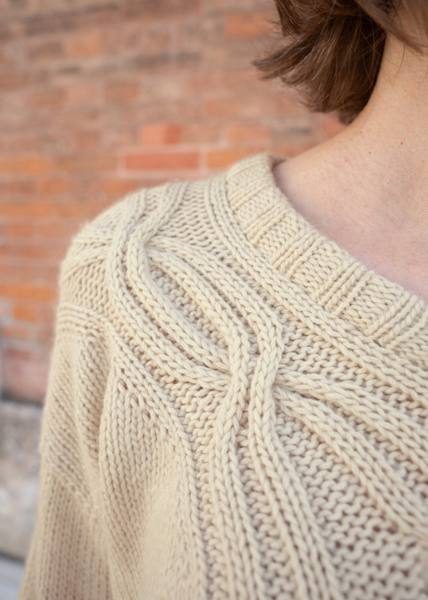 Der Sweater wird nahtlos von oben nach unten gestrickt. Eine modifizierte überzogene Schulter-Konstruktion sowie eine europäische Schulternaht hinter der natürlichen Schulterlinie sorgen für eine optimale Passform. Zunächst entsteht das Zopfband für den Rücken, aus dem anschließend die Maschen für das Rückenteil aufgenommen werden. Schultern und Armausschnitte werden mit verkürzten Reihen und Zunahmen geformt.