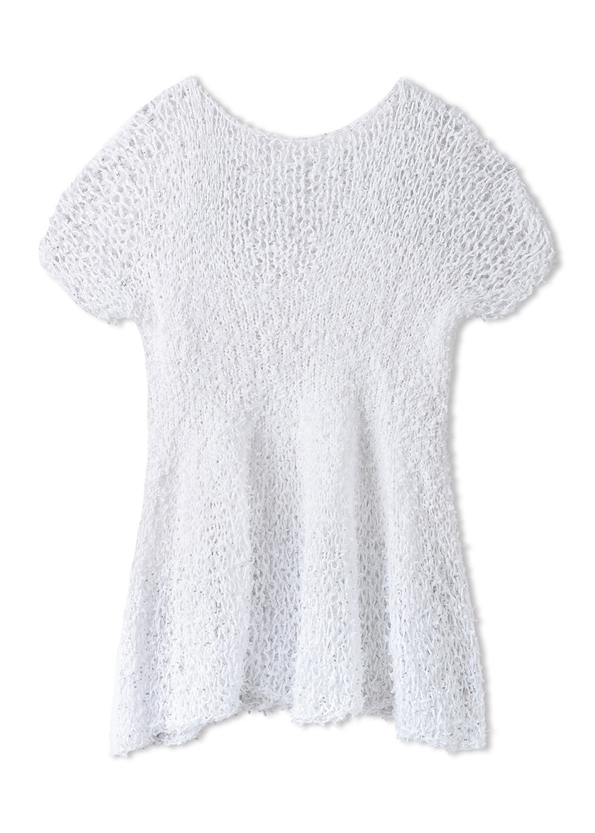 Lana Grossa-Qualität „Frizzante“ (54 % Baumwolle, 46 % Polyamid, LL = ca 105 m/50 g): ca 200 (250 - 250 - 300) g Weiß (Fb 16); Lana Grossa-Qualität „Glamour“ (55 % Polyamid, 45 % Polyester, LL = ca 115 m/25 g): ca 75 (75 - 75 - 100) g Silbergrau (Fb 1); Rundstricknadeln Nr 4, Nr 6, Nr 8 und Nr 12.
