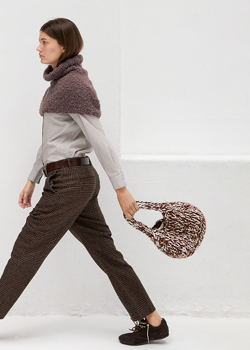 Lana Grossa „Mille II“ (50% Schurwolle (Merino), 50% Polyacryl, LL = 55 m/50 g): 150 g Rohweiß (Fb 17), Lana Grossa „Per Lei“ (100% Schurwolle (Merino), LL = 60 m/ 50 g): 150 g Schokobraun (Fb 47) und Lana Grossa „Cool Wool Vintage“ (100% Schurwolle (Merino extrafine), LL = 160 m/50g): 50 g Dunkelgrau (Fb 7391); Rundstrick-Nd Nr 9, Hilfs-Nd; Maschenmarkierer.