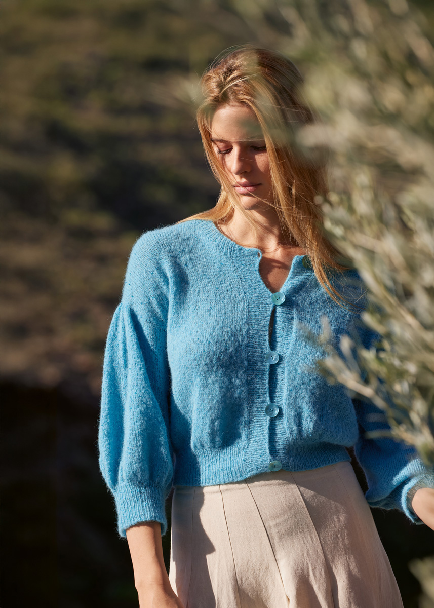 Sanfte Wärme streichelt die Haut, winzige Glasperlen funkeln mit der Sonne um die Wette. Die feine, türkisblaue JACKE bezaubert außerdem mit feminin gebauschten Ärmeln und einem exklusiven Garn: Genießen Sie den Luxus von Alpaka und Seide – Sie haben es sich verdient!