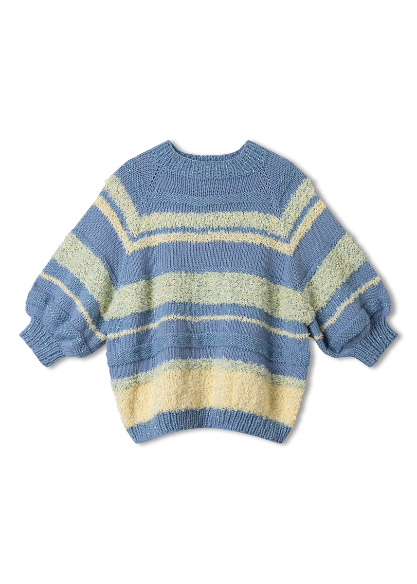 Lana Grossa Summer Softness (80% Baumwolle (Bio), 20% Schurwolle (Merino superfein), LL = ca. 130 m/50 g), 250 (250 - 300 - 300) g in Hellblau (Fb 30). Lana Grossa Frizzante (54% Baumwolle, 46% Polyamid, LL = ca. 105 m/50 g), 150 (150 - 200 -200) g in Vanille (Fb 11). Lana Grossa Glamour (55% Polyamid, 45% Polyester, LL = ca. 110 m/50 g), 100 (100 - 100 - 150) g in Zartblau (Fb 4). Je eine 80 cm und 100 cm oder 120 cm lange Rundstricknd Nr. 6; je eine 50 cm und 100 cm lange Rundstricknd sowie 5 Spielstricknd (= Nd-Spiel) Nr. 5. 8 MM.