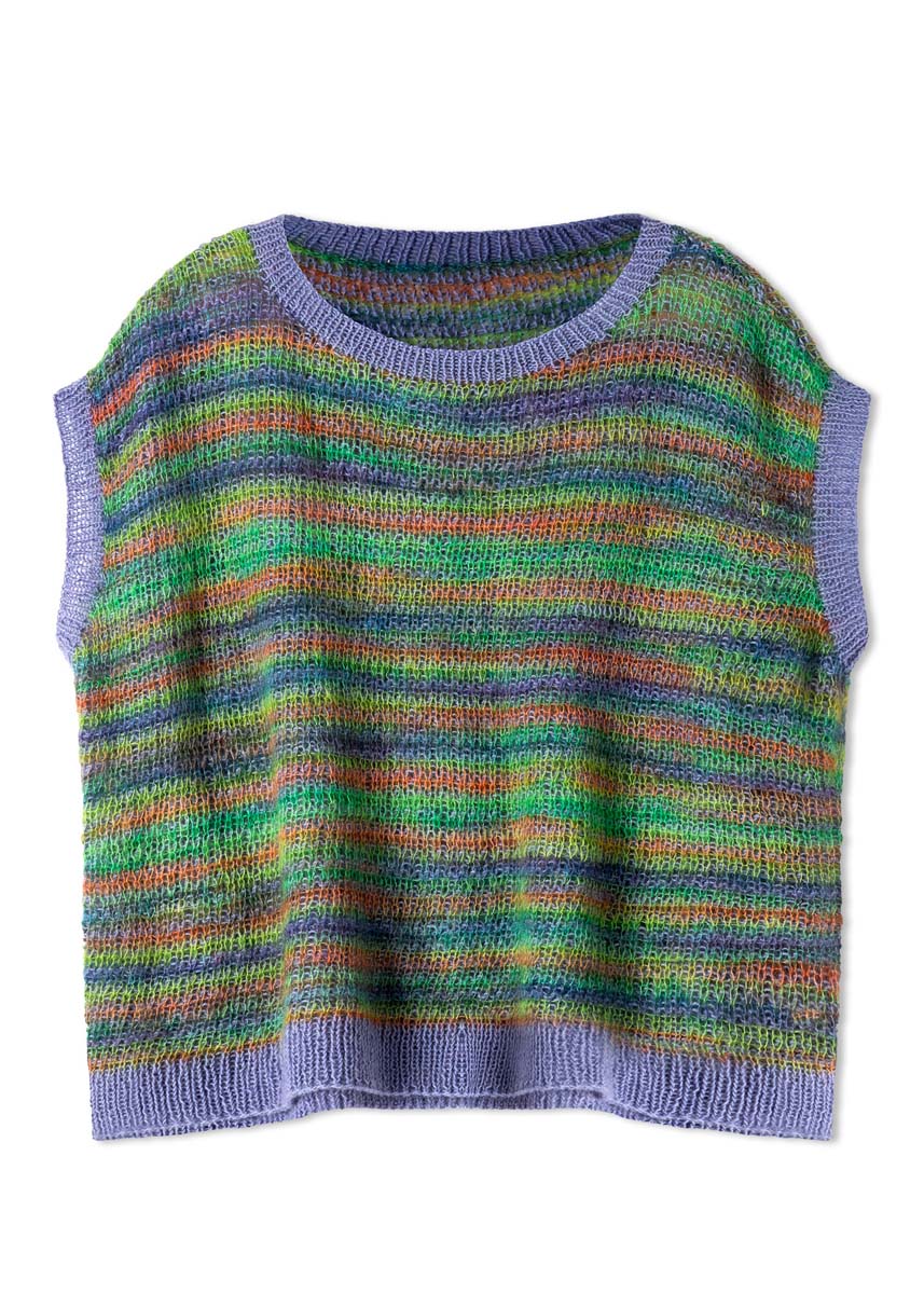 Gleiches Modell, andere Wirkung: Das Top von Seite 50, hier in intensiveren Farben. Wir lieben seine moderne Silhouette – und sein raffiniertes Hebemaschenmuster, dessen einfarbige Unterseite durch die bunte Oberseite blitzt.