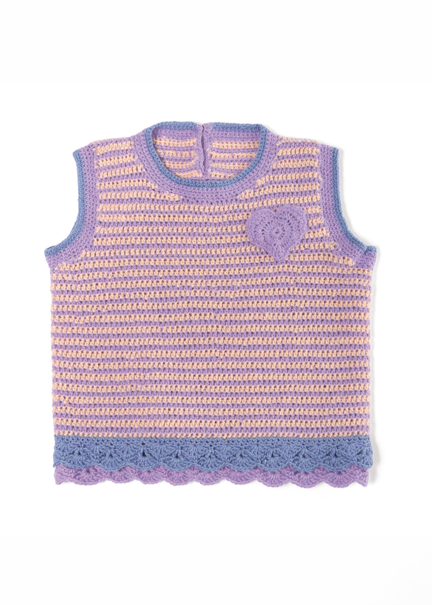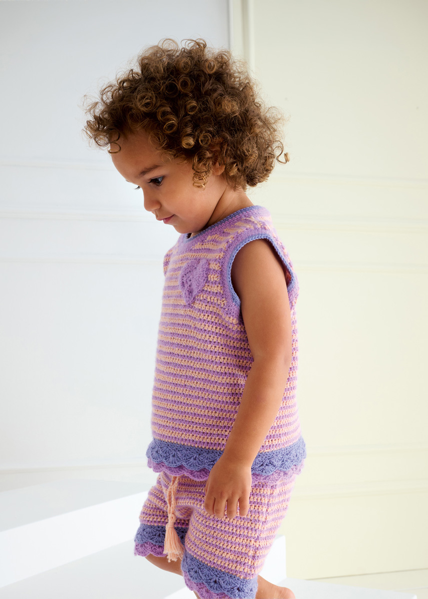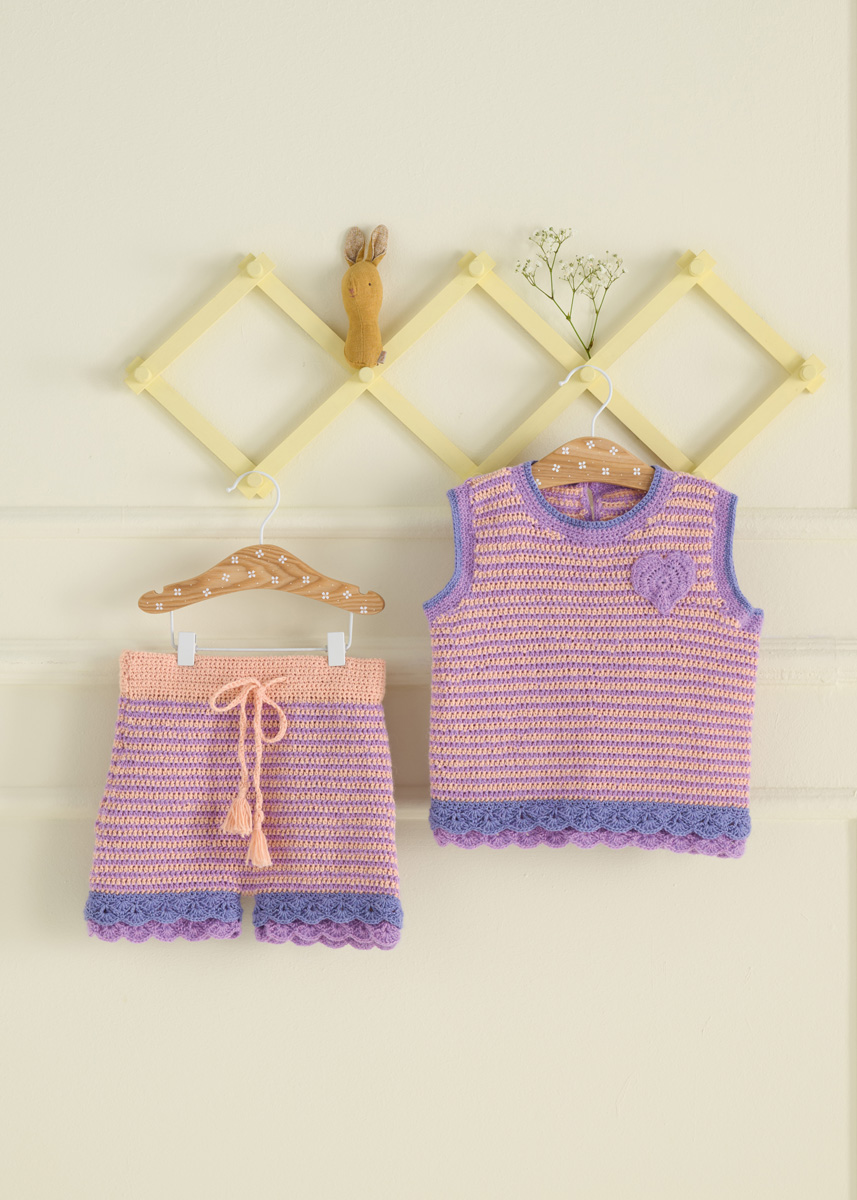 Lana Grossa Ecopuno (72% Baumwolle, 17% Schurwolle (Merino), 11% Alpaka (Baby); LL = 215 m/50 g): 50 (100/100/100) g Lila (Fb. 92), 50 (50/50/100) g Apricot (Fb. 99) und 50 g Lilablau (Fb. 214); eine Häkelnadel 3,5 mm; entfernbare Maschenmarkierer (alternativ Sicherheitsnadeln); 1 Knopf mit 7 mm Durchmesser.