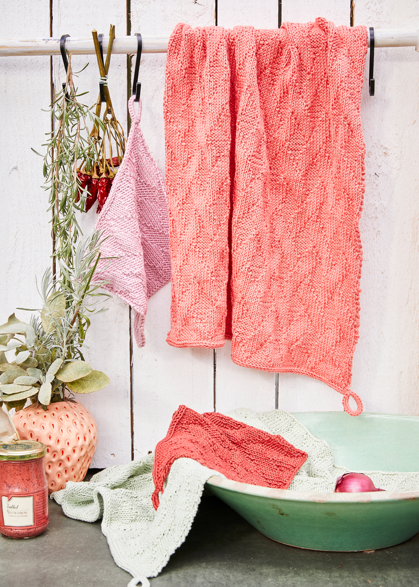 Lana Grossa-Qualität „Landlust- Baumwolle“ (100% Baumwolle, LL ca. 115 m/ 50 g), für die Spültücher je 50 g in Lindgrün (Fb 10) bzw. in Jeans (Fb 14) bzw. in Altrosa (Fb 17) bzw. in Rostrot (Fb 7) und für die Trockentücher je 150 g in Frühlingsgrün (Fb 24) bzw. in Minttürkis (Fb 25) bzw. in Lachs (Fb 20) bzw. in Lindgrün (Fb 10); Stricknadeln Nr. 4, 1 Häkelnadel Nr. 4.