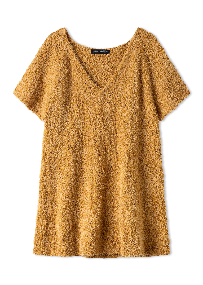 Lana Grossa-Qualität „Frizzante“ (54 % Baumwolle, 46 % Polyamid, LL = ca 105 m/50 g): ca 350 (400 - 450 - 500) g Ockergelb (Fb 2); kurze und lange Rundstricknadel Nr 5; Maschenmarkierer; Häkelnadel Nr 5.