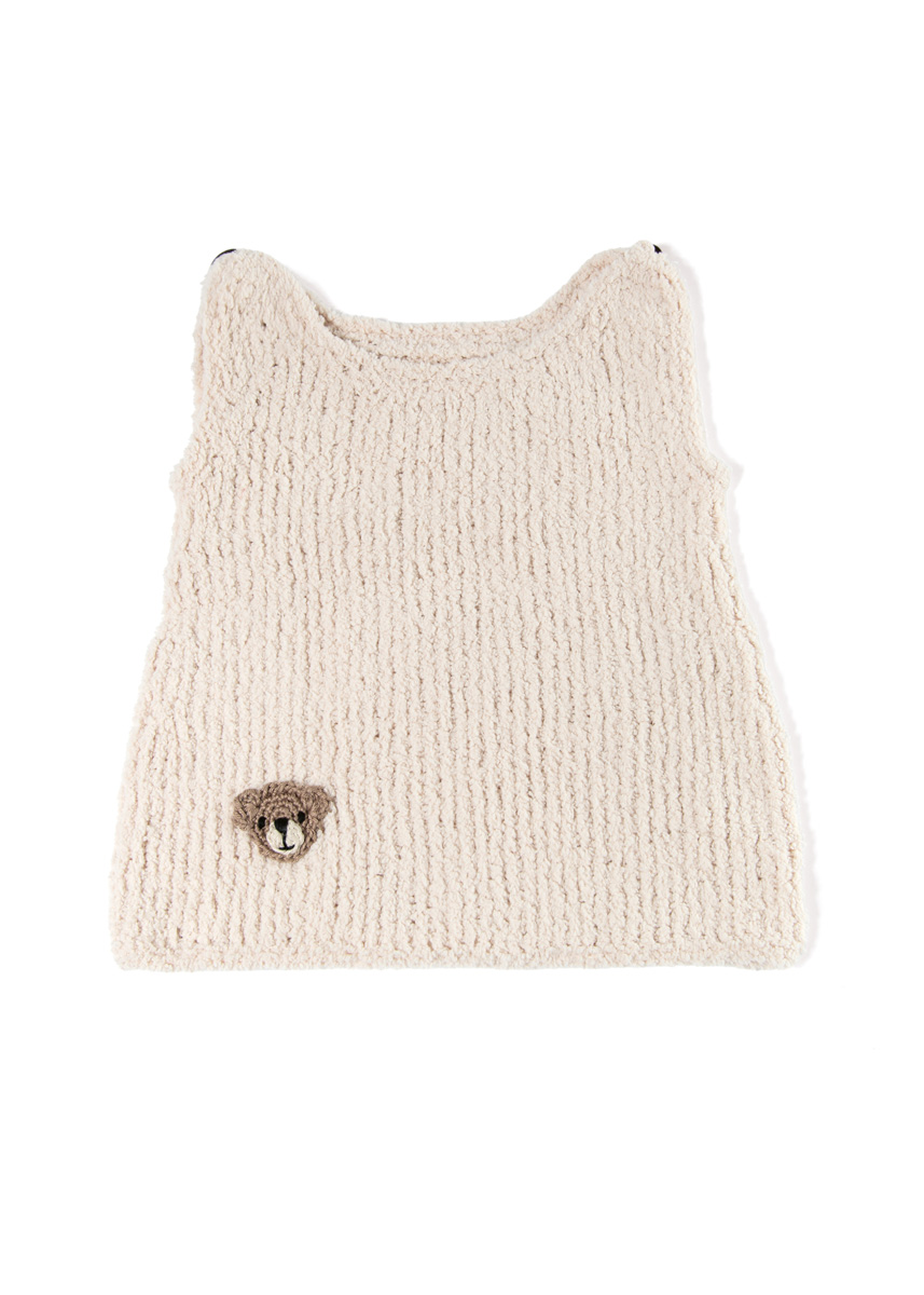 Lana Grossa Leggerissimo (100% rec. Polyamid); LL = 150m/50 g): 50 (50/100/100/150)g Hellbeige (Fb. 16) und Cotone (100% Baumwolle; LL = 125 m/50 g): je 50 g Camel (Fb. 112), Hellbeige (Fb. 115) und Schwarz (Fb. 21); eine Rundstricknadel 4,5 mm; je eine Häkelnadel 2,5 und 4 mm; 2 Knöpfe mit 18 mm Ø.