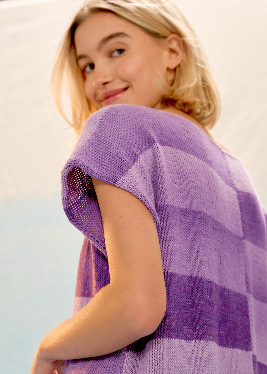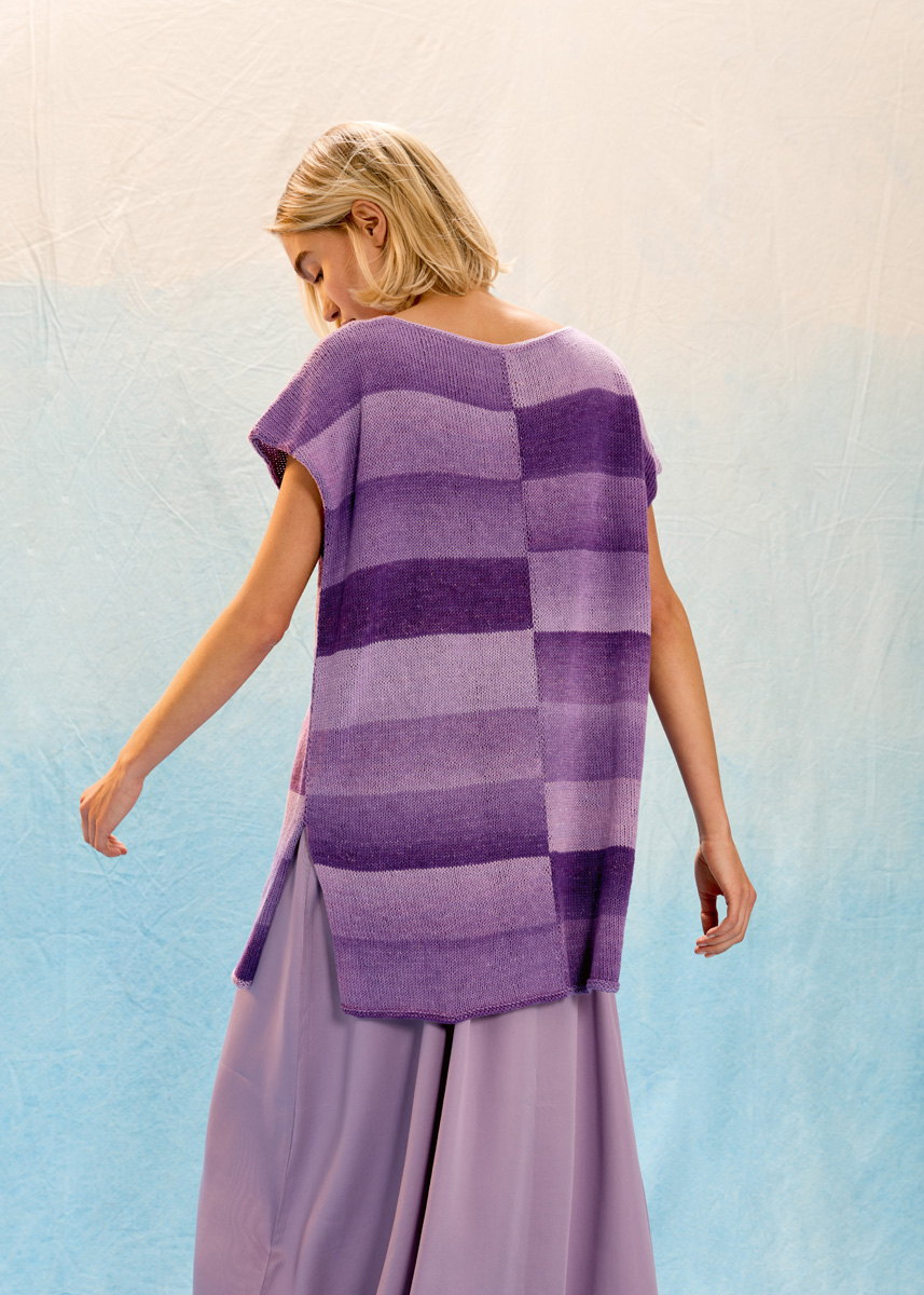 Lana Grossa-Qualität „Gomitolo Tono“ (100 % Baumwolle (Bio), LL = ca 360 m/100 g): ca 3 (4 - 4 - 4) Knäuel = ca 300 (400 - 400 - 400) g Lila/Pflaume/Violett (Fb 1043); Rundstricknadeln Nr 3 und Nr 3,5. Häkelnadel Nr 3,5.