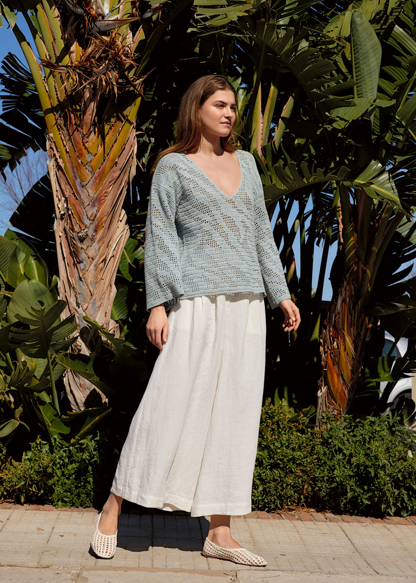 Kühler Farbton, klarer Schnitt: Der Pullover im Zebramuster wird in Filettechnik gearbeitet. Für den sinnlichen Twist sorgt SUMMER CASHMERE.