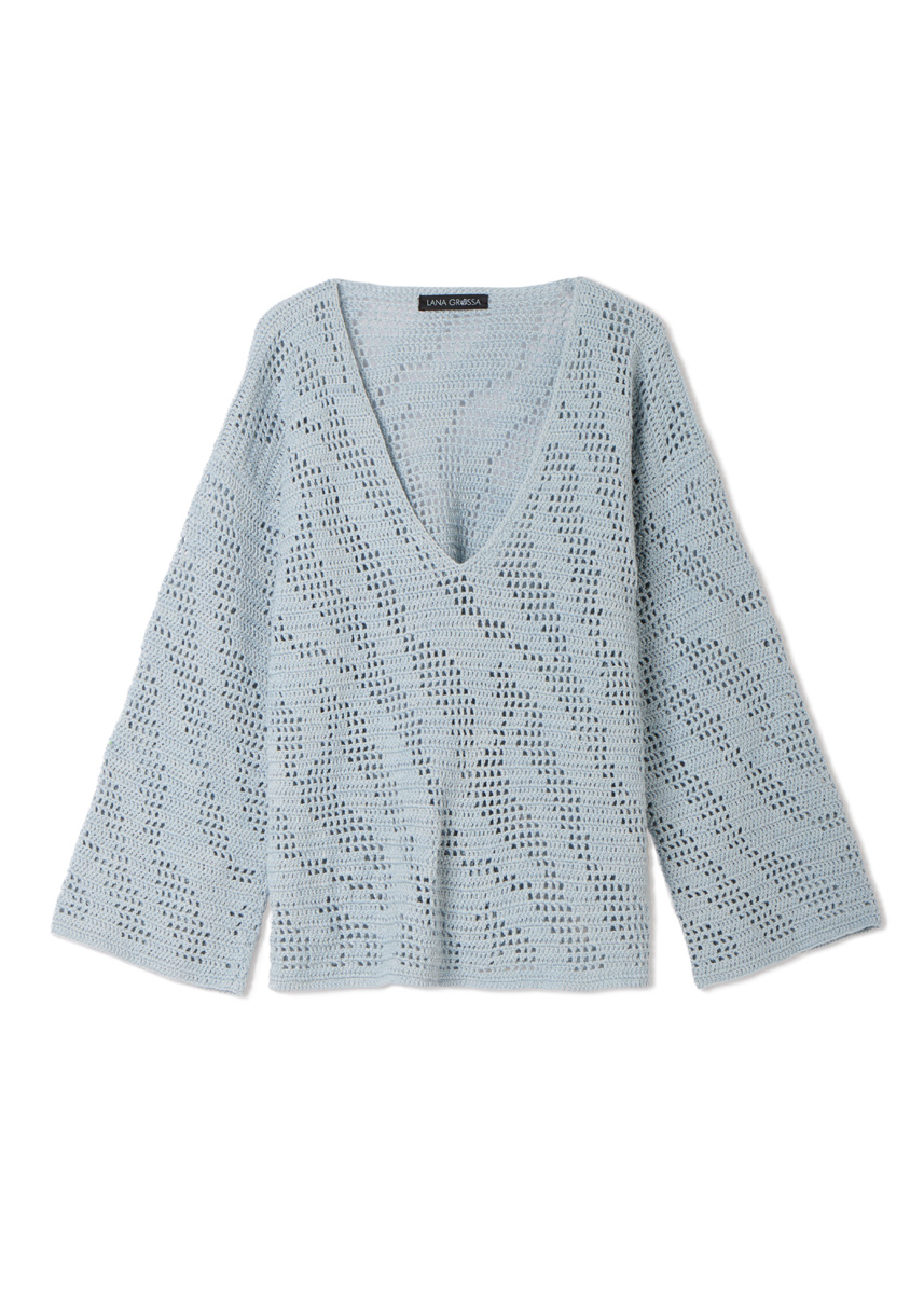 Lana Grossa-Qualität „Summer Cashmere” (90 % Baumwolle, 10 % Kaschmir, LL = ca. 210 m/50 g): ca. 400 (450) g Lichtblau (Fb. 22); 1 Wollhäkelnadel Nr. 3.
