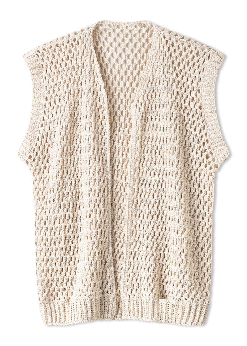 Die Crochet-WESTE im Netzmuster hat eine gerade Silhouette und gerippte Häkelblenden. Der neutrale Creme- Ton macht sie hübsch vielseitig.