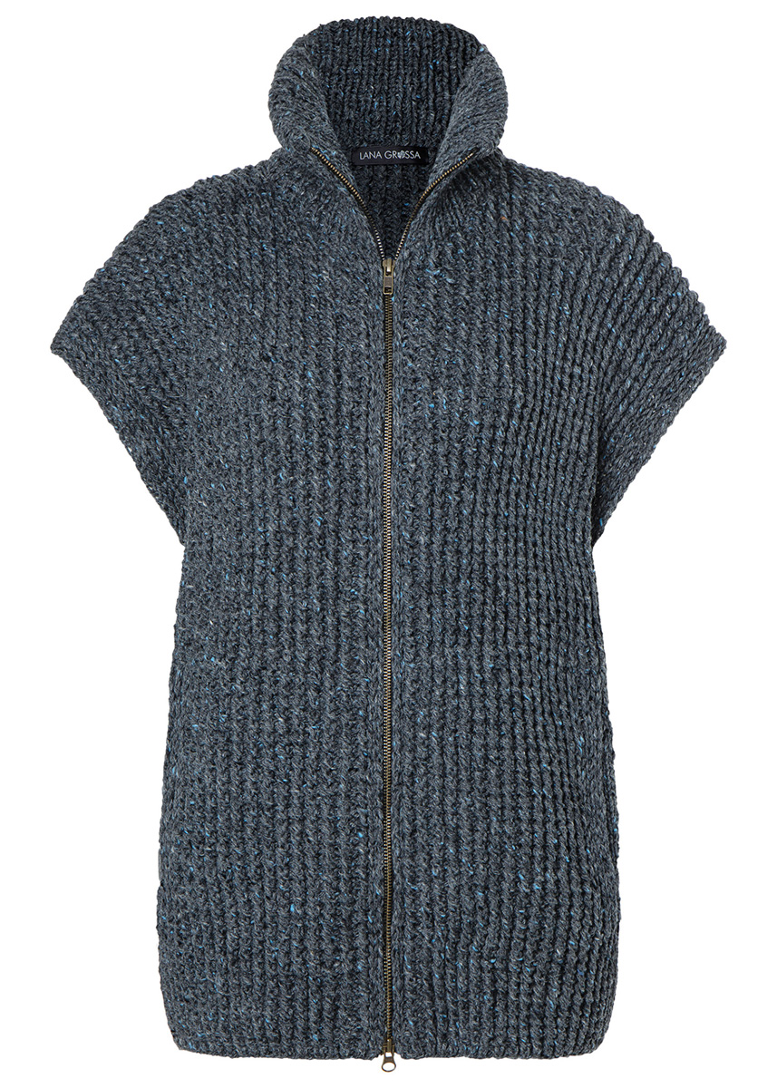 Lana Grossa Landlust Soft Tweed 90 (100% Schurwolle, Lauflänge 90 m/50 g), 800 (850 – 900) g Anthrazit meliert (Fb 5); Stricknadeln Nr. 4 und 6, 1 Rundstricknadel Nr. 6, 40 cm lang, 1 Zwei-Wege- Reißverschluss von YKK, Metall, Fb Anthrazit, 75 cm lang.