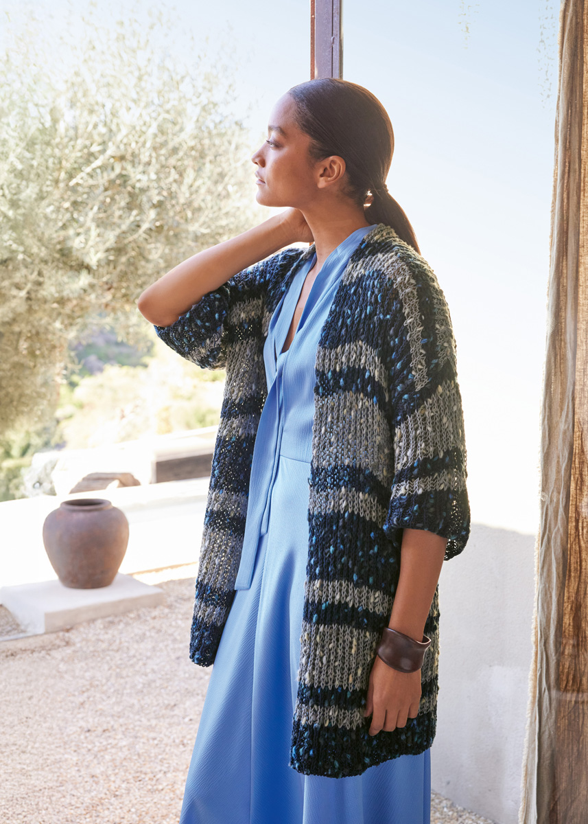 Weil die WESTE ganz relaxt ohne Knopflöcher, Blenden und Armkugeln auskommt und noch dazu im Patentmuster mit Nadeln No. 7 gestrickt wird, stellt sich der Erfolg schnell ein. Die strengen Streifen werden durch farbige, weiche Noppen aufgemischt. Grazie mille.