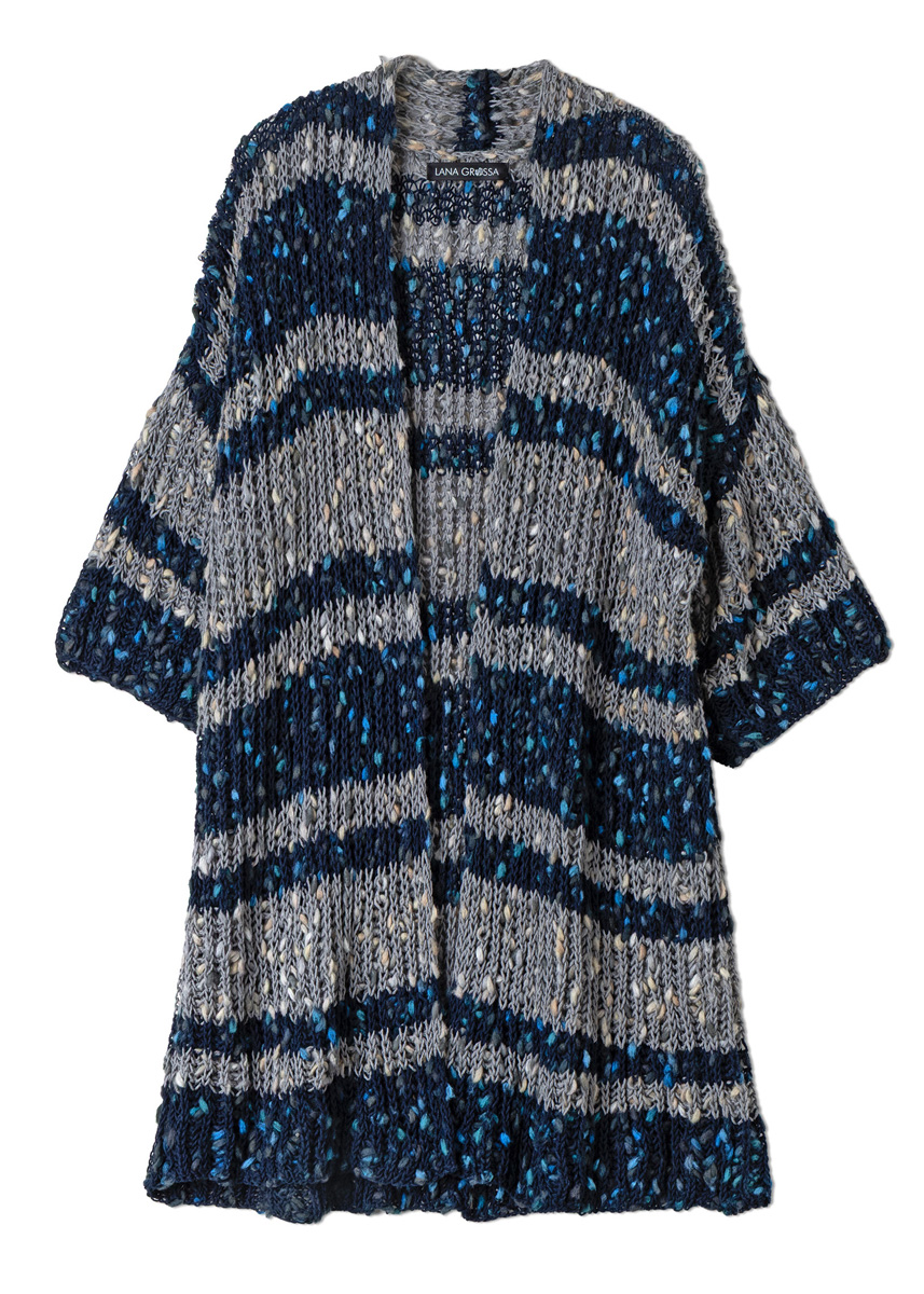 Lana Grossa Popcorn (100% Baumwolle, Lauflänge 125 m/50 g), je 250 (250 - 300) g in Nacht-/Hell-/Dunkelblau/Türkis (Fb 7) und in Grau/Beige/Grège/Camel (Fb 11); Stricknadeln Nr 7.