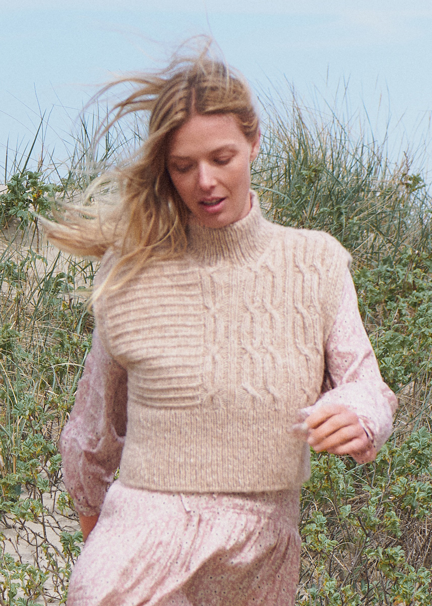 Dieser lebhaft melierte Pullunder besteht aus einem weichen, unkomplizierten Schlauchgarn. Dazu gibt es einen Strukturmustermix und Ärmelblenden aus Hebemaschen. Für elastische Ränder wird italienisch angeschlagen und abgekettet.