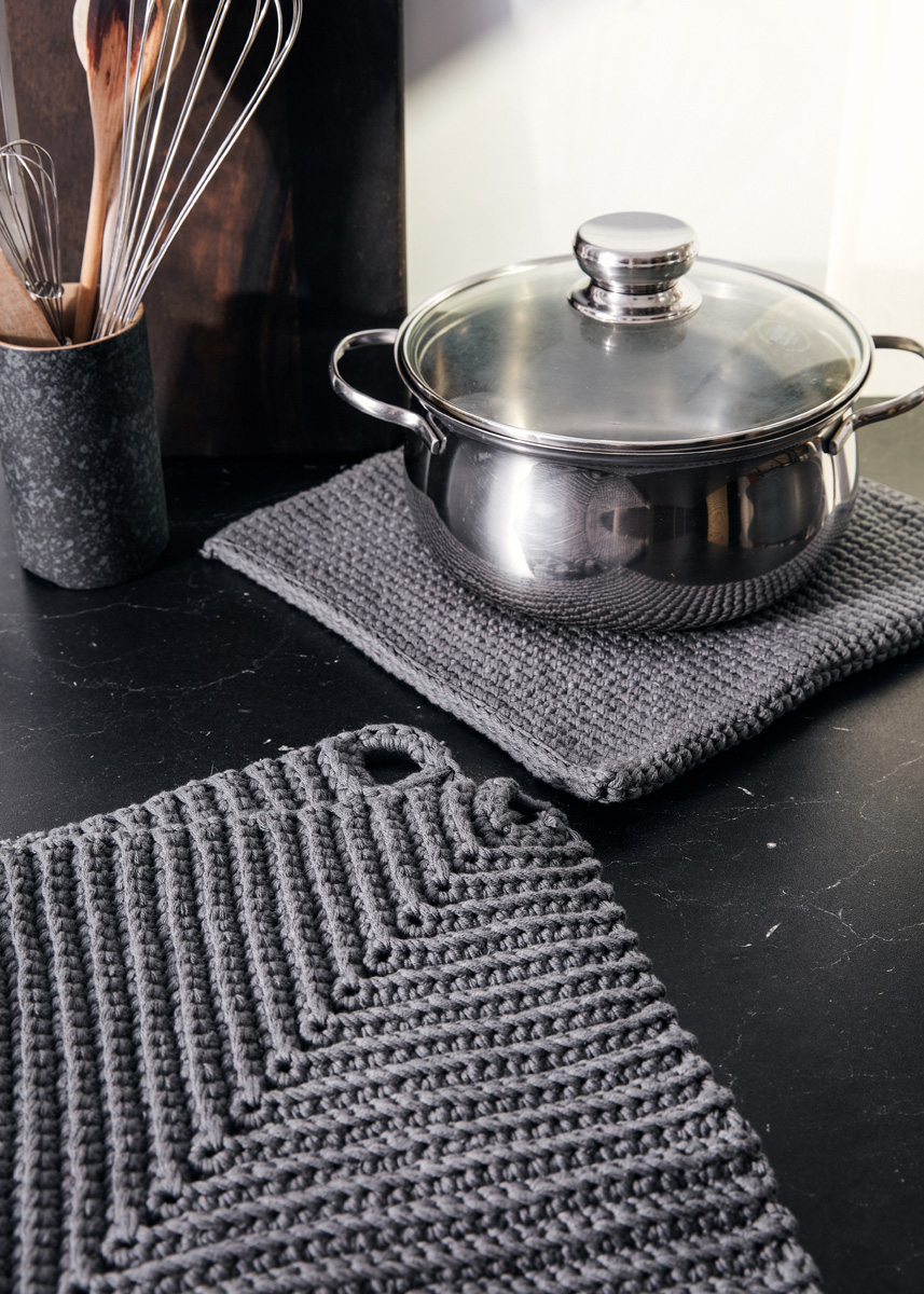 Lana Grossa-Qualität „Organico” (100 % (Bio) Baumwolle, LL = ca. 90 m/50 g): ca. 200 g Dunkelgrau (Fb. 156); 1 Wollhäkelnadel Nr. 6.