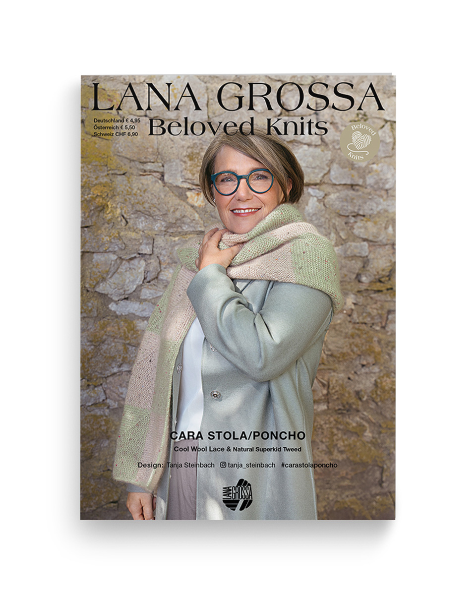 Für die Cara-Stola werden insgesamt 33 Patches abwechselnd in der Farbkombination Perlbeige mit Natur und Pastellgrün mit Graugrün gearbeitet. Dabei werden die Patches gleich so aneinander gestrickt, dass sich 3 Reihen aus jeweils 11 Patches im Schachbrettmuster übereinander reihen. Anschließend wird die Stola rundherum mit einem Kordelrand eingefasst. Für den Cara-Poncho werden zunächst insgesamt 33 Patches mit je 1 Faden Cool Wool Lace und Natural Superkid Tweed gearbeitet. Dabei werden die Patches gleich so aneinander gestrickt, dass sich 3 Reihen aus jeweils 11 Patches übereinander reihen. Dann wird das Rechteck zur Hälfte gelegt und die Schulternaht geschlossen. Aus dem Halsausschnitt werden Maschen herausgestrickt und der doppelte Kragen kraus rechts in Runden gestrickt. Aus dem Armloch werden ebenfalls Maschen herausgestrickt und der Ärmel kraus rechts in Runden gestrickt. An den noch offenen Strickrand des Ponchos wird anschließend ein Kordelrand angestrickt.
