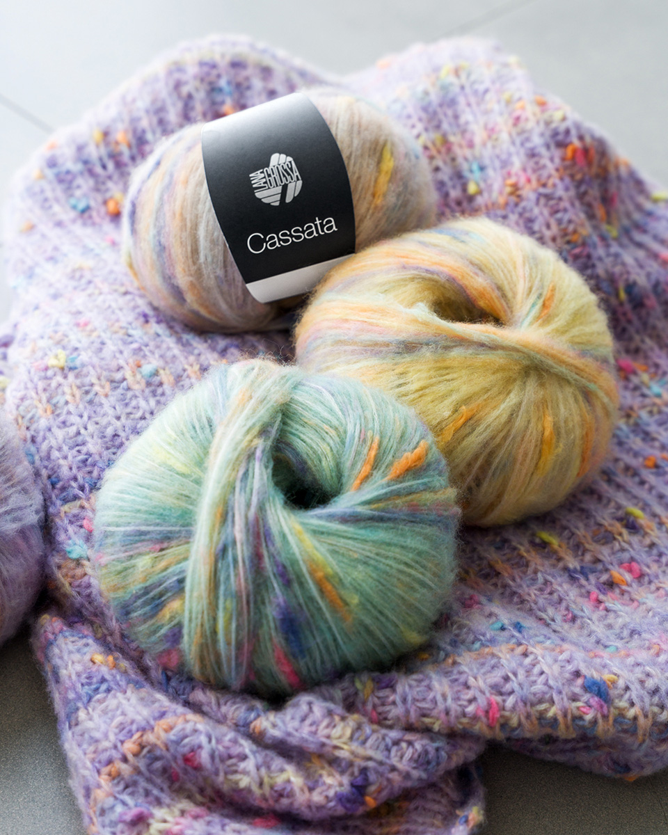Mit Cassata bringt Lana Grossa ein Garn auf die Nadel, das Leichtigkeit, Volumen und Farbe in perfektem Zusammenspiel vereint. Die Mischung aus Baumwolle und Schurwolle sorgt für ein wunderbar weiches Tragegefühl und ein leichtes Maschenbild mit modernem Charakter.