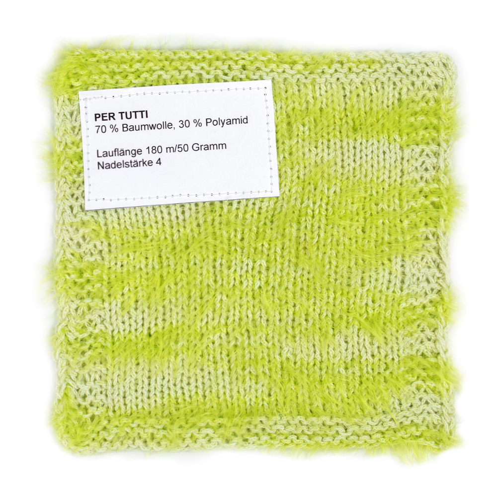 Per Tutti ist ein leichtes Baumwollgarn mit spannender Struktur und modernem Charakter. Glatte, dezent glänzende Partien wechseln sich mit weichen, flauschigen Abschnitten ab – das sorgt für ein lebendiges Maschenbild und einen besonders angenehmen Griff.